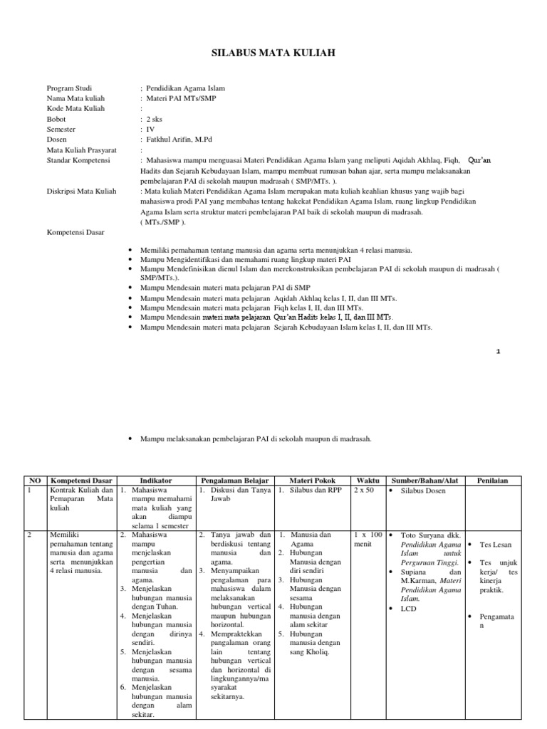 Silabus Mata Kuliah Materi Pai