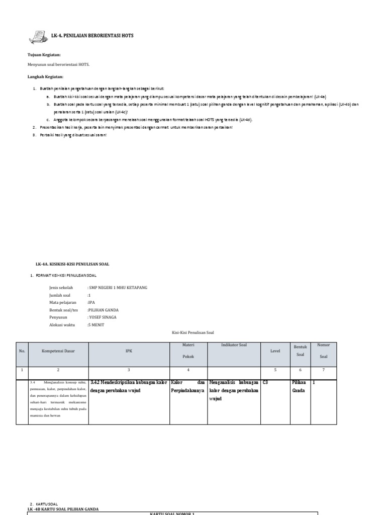 Contoh Penilaian Berorientasi Hots Lengkap Dengan Kisi Kisi Soal Contoh Soal Kunci Jawaban Dan Penskoran Pada Materi Kalor Ipa Kls Vii Jdsk