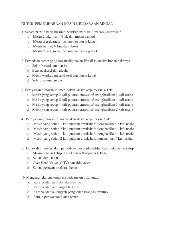 Untuk memperbaikinya sampai suatu kondisi yang bisa diterima. Soal Mesin Otomotif Kelas XI Semester 1 - Soal mesin otomotif kelas xi semester 1 merupakan kumpulan dari beberapa soal mengenai kompetensi mesin otomotif.