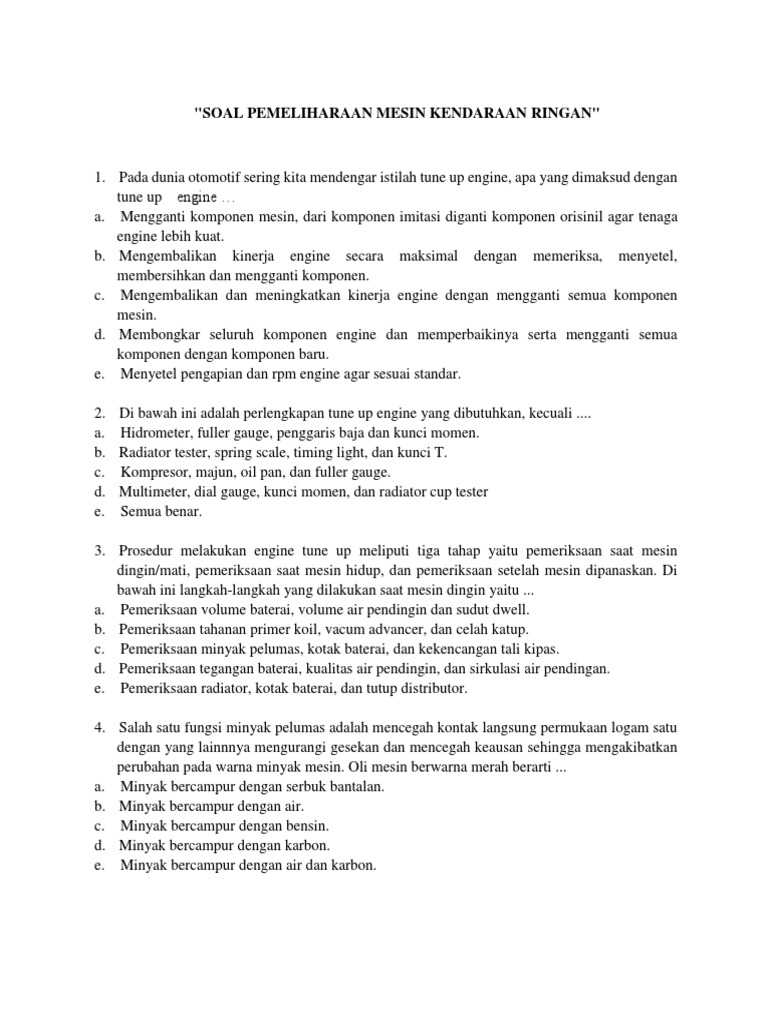 Soal Dan Jawaban Pemeliharaan Mesin Kendaraan Ringan Enak